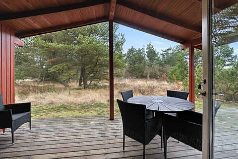 Fra stuen er der direkte adgang til en delvist overdækket terrasse, som er lukket og egnet til både måltider og afslapning. Terrassen vender ud mod den store naturgrund, hvor man kan opholde sig ugeneret og være tæt på landskabet.