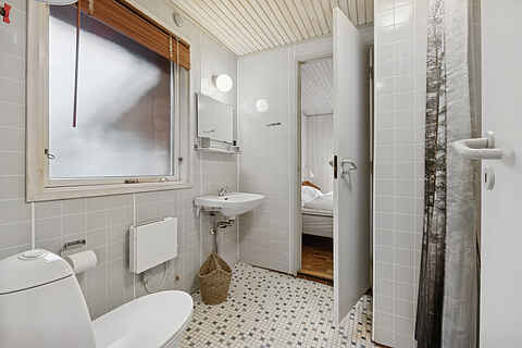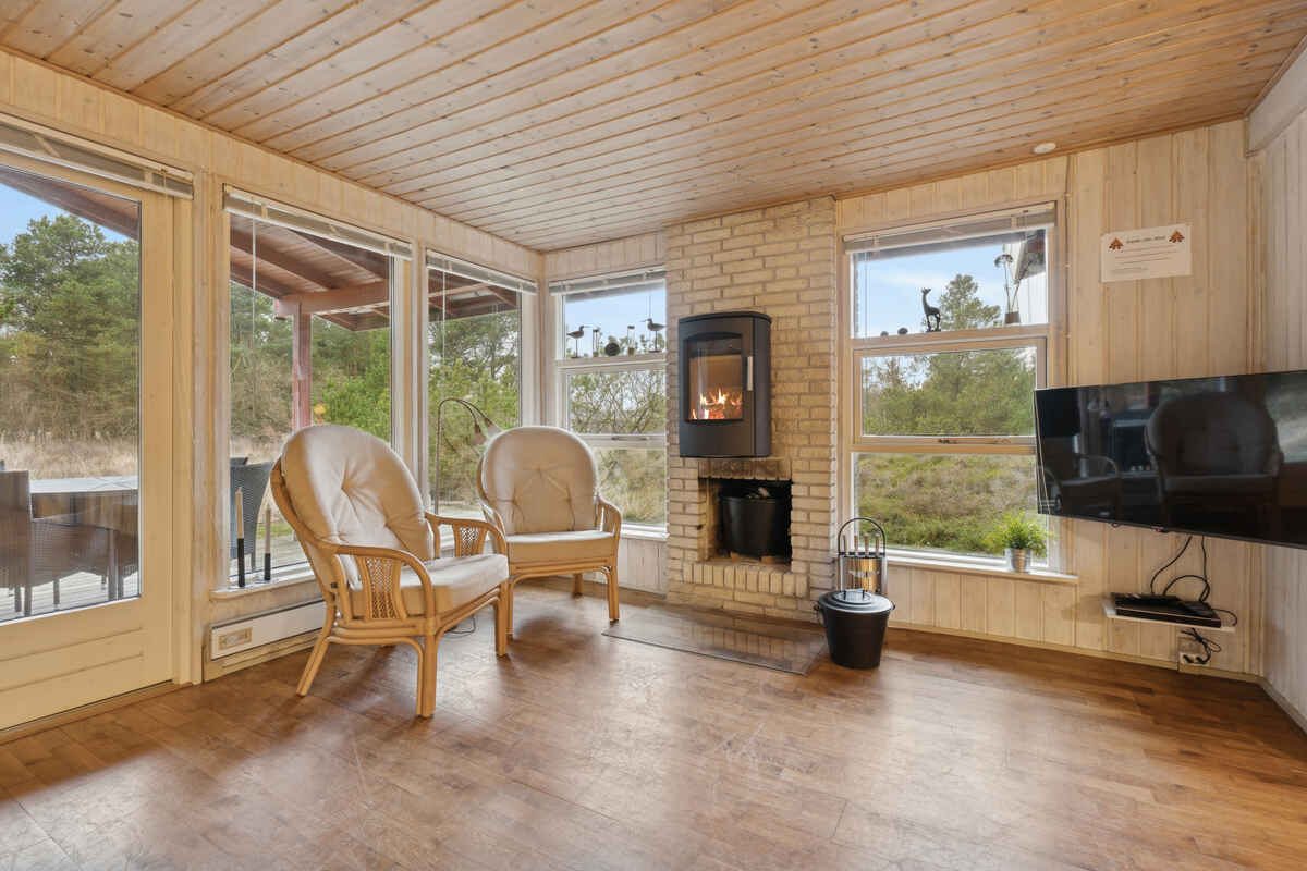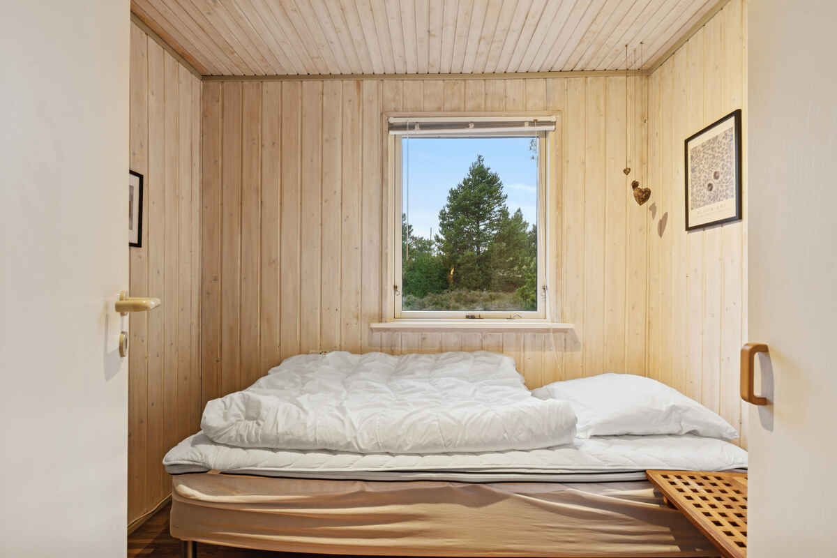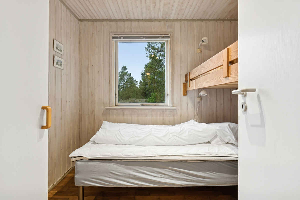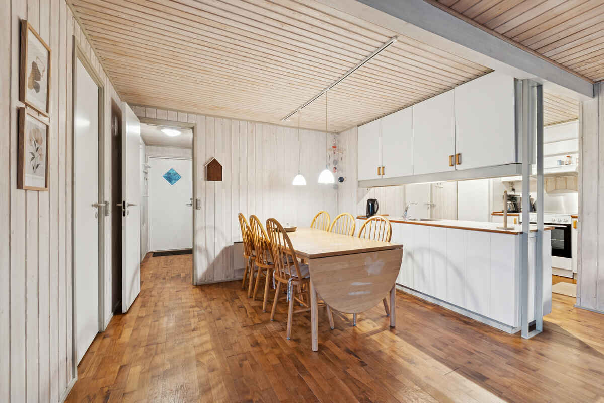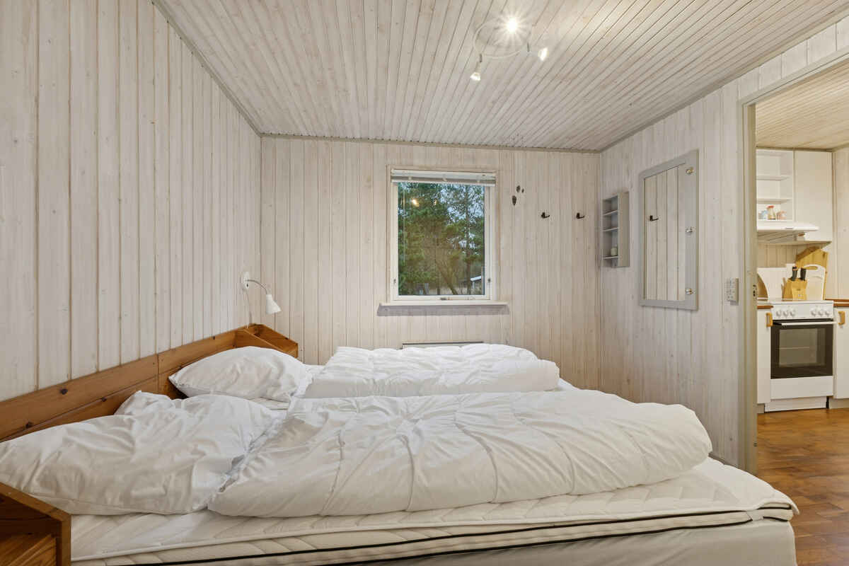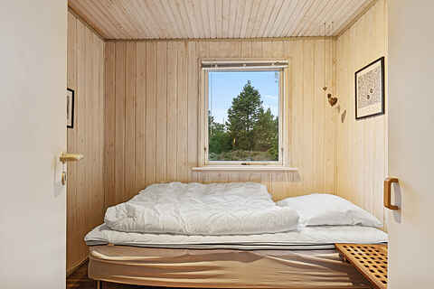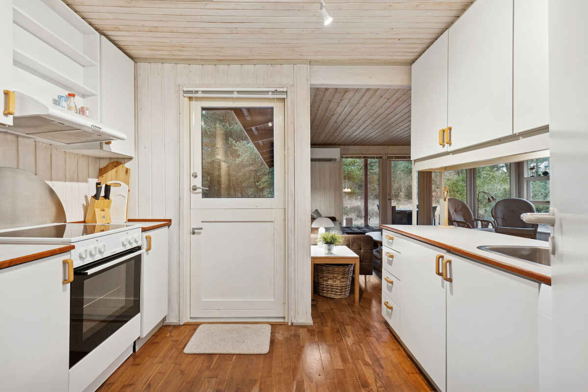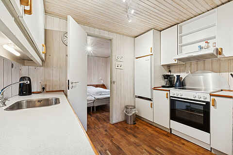 Indenfor ligger køkken, spiseplads og stue i ét sammenhængende rum. Her findes en brændeovn, som skaber en behagelig stemning på kølige dage. Huset har tre soveværelser fordelt på et med dobbeltseng, et med enkeltseng og et med køjeseng.
