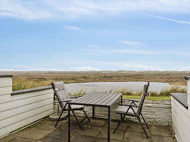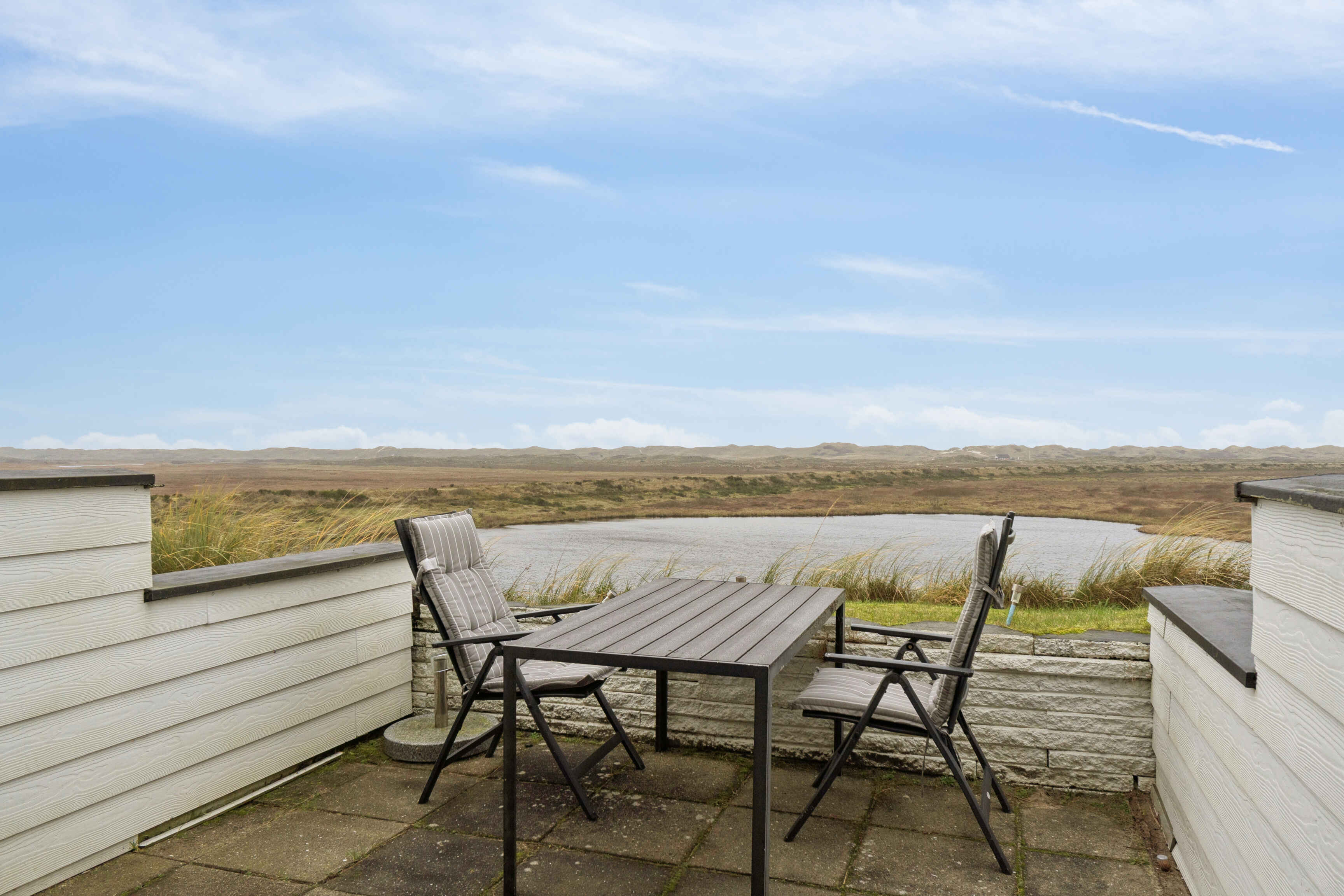 Fra terrassen kan udsigten over landskabet nydes i læ og uden forstyrrelser. Her kan dagen starte med frisk luft eller afsluttes i ro, mens lyset skifter over vand, eng og himmel.