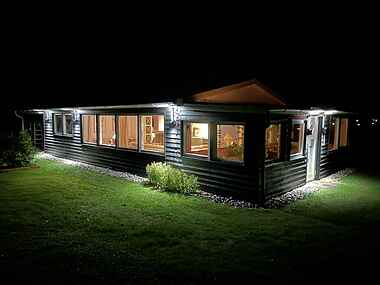 Stemningsfuld udendørs belysning, der skaber hyggelig ferieatmosfære om aftenen