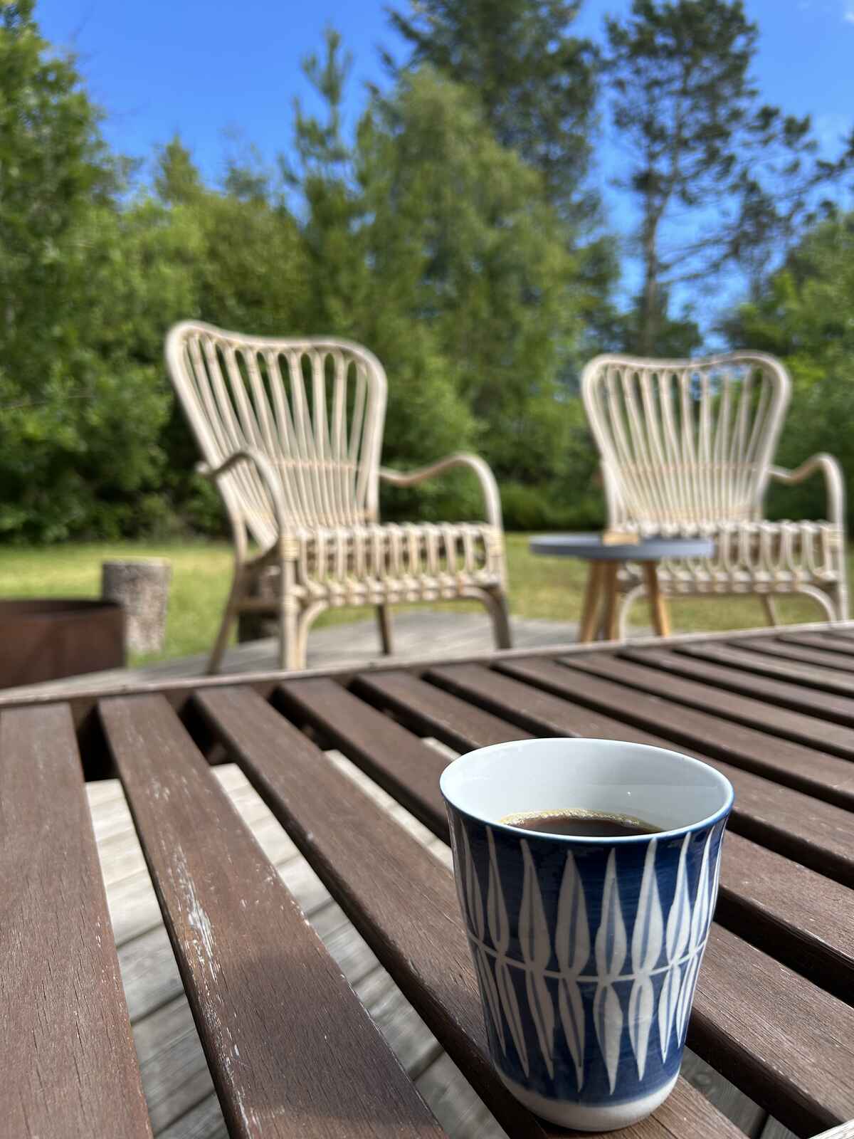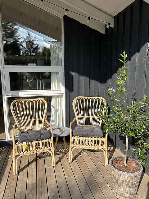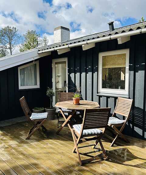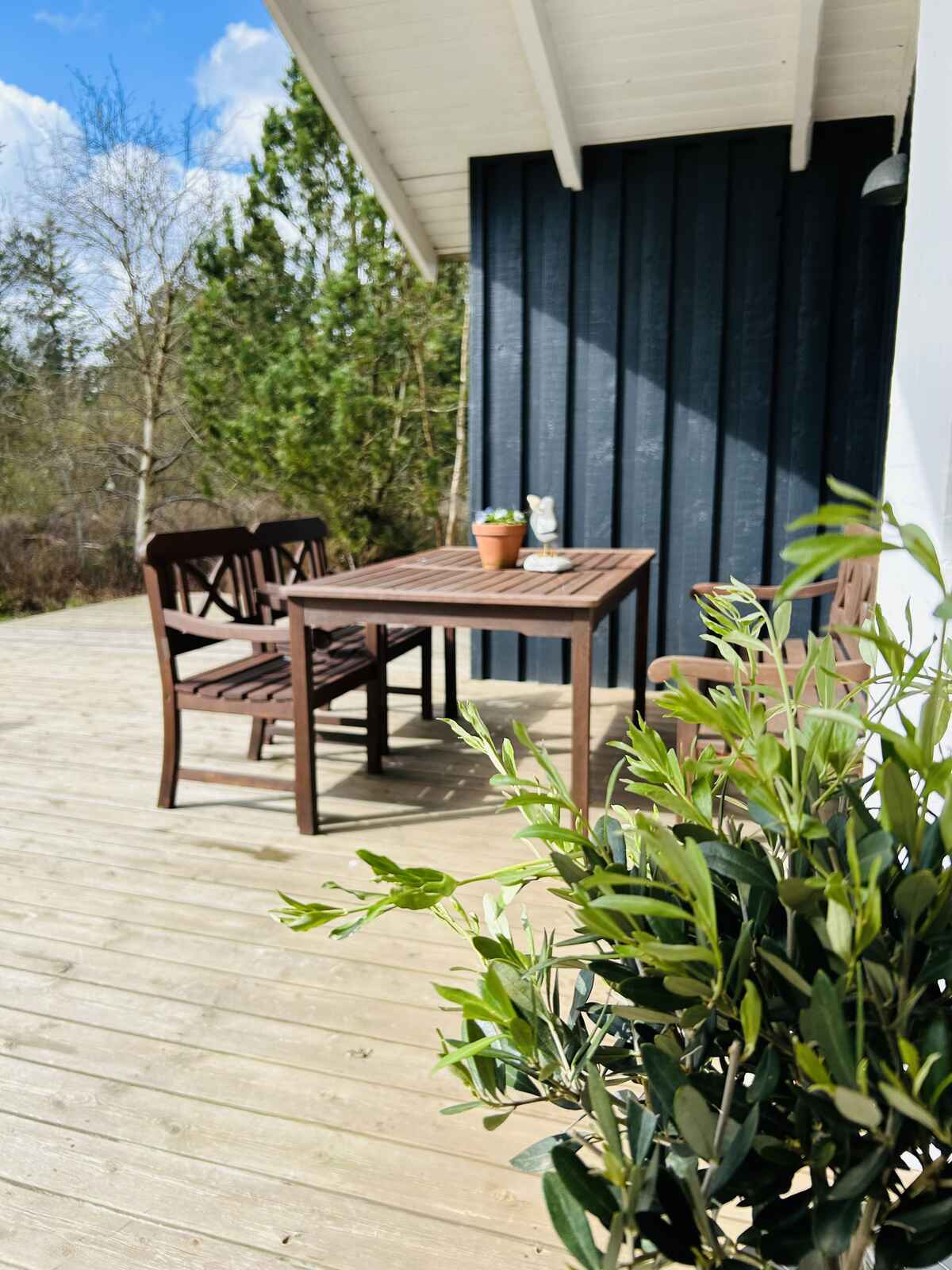 Fra køkkenalrummet fører franske døre ud til to store, privat beliggende terrasser. Disse charmerende udendørs arealer er ideelle til at nyde måltider under åben himmel, solbadning i uforstyrrede omgivelser eller aftenhygge under stjernerne. Terrasserne er omgivet af modne træer og frodig beplantning, der sikrer privatliv og en følelse af at være ét med naturen.