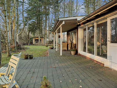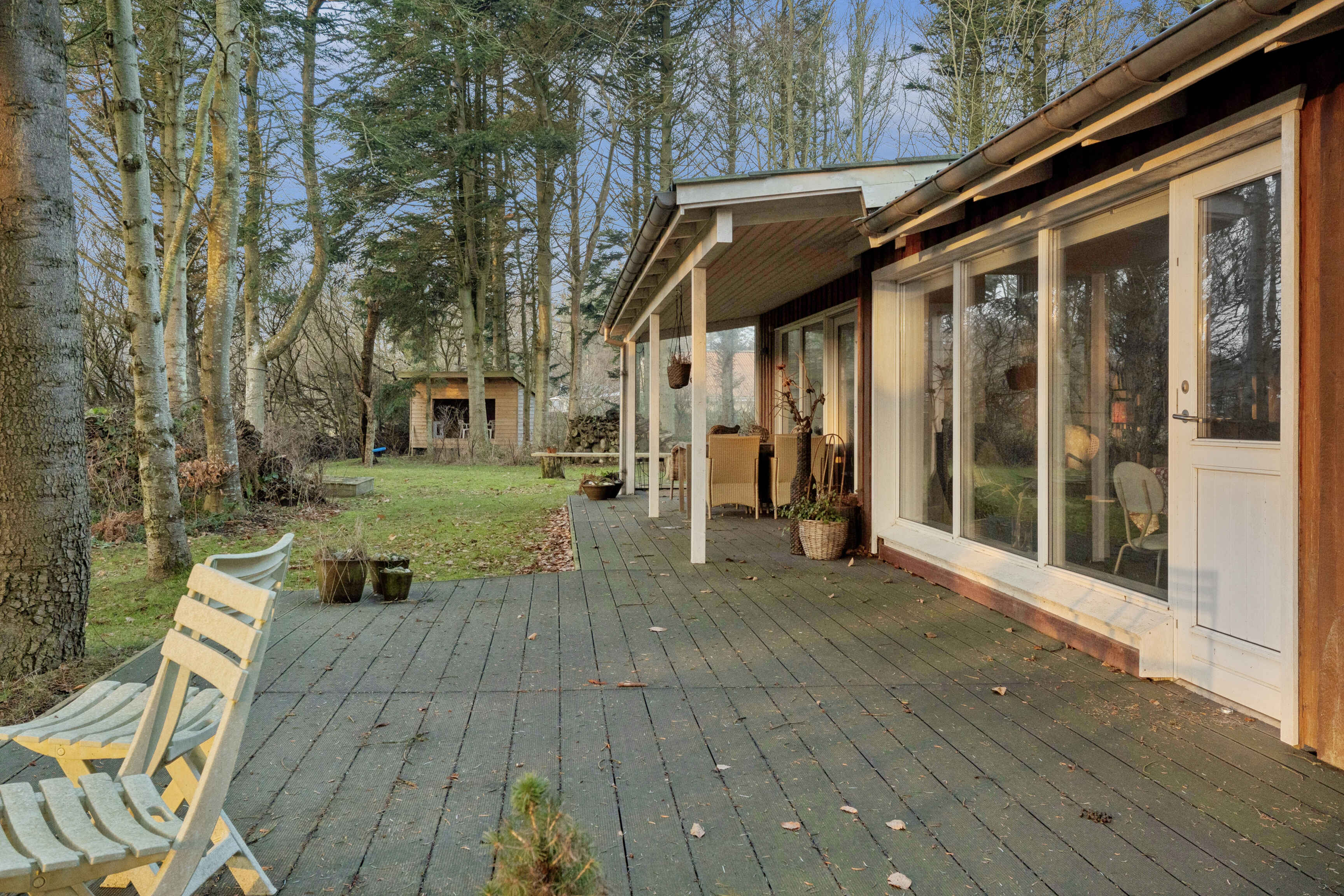 Huset ligger på en 2.250 m2 grund, der både rummer græsarealer og skov. På grunden er der desuden et shelter til fri afbenyttelse. Grunden ligger roligt og ugenert ud til en grusvej.