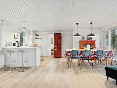 Huset er på 116 m2 og består af en oprindelig, men renoveret, del fra 1969, og en nybygget del fra 2014. Man kommer ind i huset igennem bryggerset, hvor man til den ene side har et stort soveværelse med dobbeltseng (180×200) og et badeværelse, og til den anden side kommer ind i køkken/alrummet. Køkkenet er fra 2023 og rummer fint plads til 6 personer. Fra alrummet er der adgang til husets meget hyggelige og rummelige stue hvor der både er brændeovn og en sofagruppe. Her er der forskellige bøger og spil til fri afbenyttelse. Herudover er der adgang til en hyggelig hems. Fra både stue og alrummet er der adgang til en delvist overdækket terrasse.