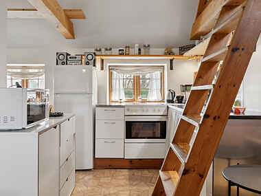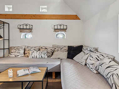 Stuen byder på 2 senge, som bruges som sofa. Over badeværelse er der en hemst med dobbeltseng.