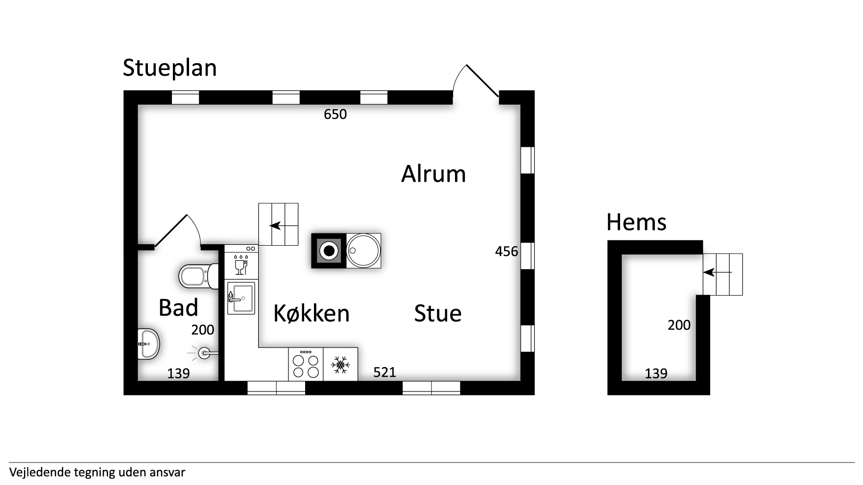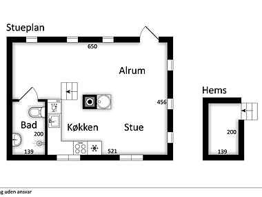 Stuen byder på 2 senge, som bruges som sofa. Over badeværelse er der en hemst med dobbeltseng.
