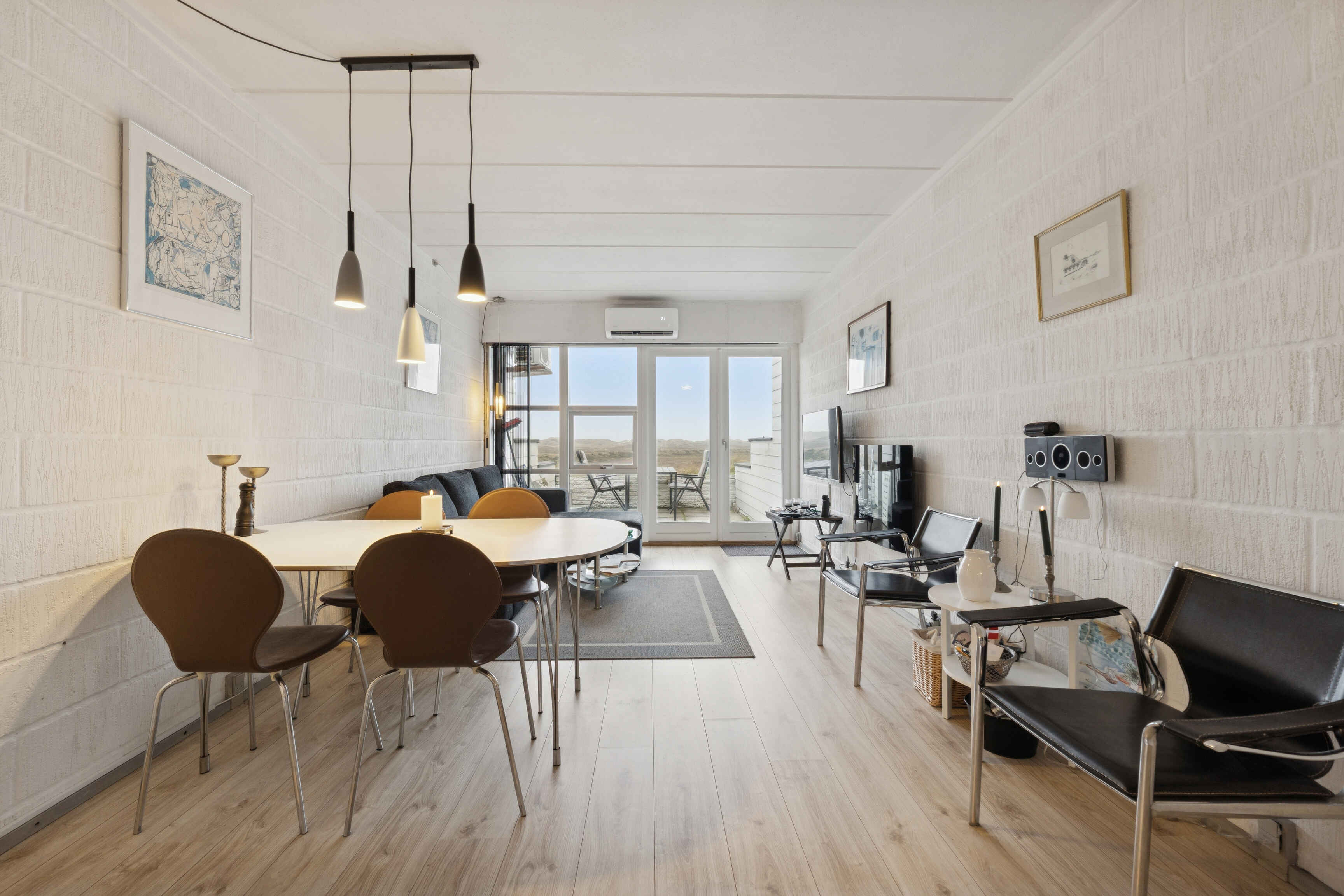 Indretningen er enkel og funktionel med køkken og opholdsrum i åben forbindelse. Her er plads til at samles over måltider eller en stille aften efter en dag udendørs. Store vinduer giver et fint lys og skaber nærvær til omgivelserne.