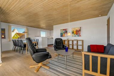 Efter at have hentet nøglen på kontoret i Vrist starter en smuk tur af små snoede veje til Bovbjerg. Allerede på lang afstand tårner Bovbjerg Fyr sig op. I det smukke, bakkede landskab er man ikke i tvivl om, at man nærmer sig noget unikt. Parker bilen i carporten og start udpakningen. En dejlig entré byder velkommen, og allerede her er man ikke i tvivl om, at dette hus og dens beliggenhed er noget ganske særligt. Huset er 150 m2 og har 4 store soveværelse (1DS, 1DS, 1DS, 2ES) med god skabsplads i alle soverum. 2 af soverummene har udsigt til Vesterhavet. Træd ind i den hyggelige opholdsstue som er udstyret med helt nye, moderne møbler. Der er masser af siddepladser i de flotte lædermøbler, smart-TV, som har indbygget danske og tyske Tv-programmer, radio og mulighed for streamings tjenester, et flot spisebord med siddepladser til alle og den unikke panoramaudsigt til Vesterhavet fuldender oplevelsen. En varmepumpe søger for, at alle kan holde varmen på alle årstider til en billig pris. Åbent, godt udstyret køkkenhjørne med alt i hvidevarer, opvaskemaskine, mikroovn, komfur med keramiske kogeplader og køleskab med fryseboks. Nyd et glas rødvin når der laves mad i dette nye køkken. Huset har praktiske trægulve i såvel opholdsrum som soverum. Stort badeværelse md gulvvarme, toilet, håndvask, bruseniche og 2-personers spabad. Ekstra badeværelse med gulvvarme, toilet, håndvask og bruser. Baggang med vaskemaskine, tørretumbler og ekstra bordplads. Ikke ryger hus. Max 1. husdyr er tilladt. Har man en el-bil eller hybrid så findes der et CEE-ladestik ved huset.