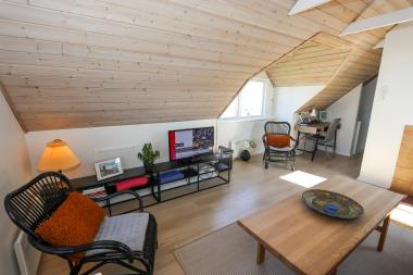 Via trappen for enden af spisestuen kommer I let op på 1. etage. Her er der udover soveværelset en dejlig opholdsstue med sofagruppe, TV med danske og tyske kanaler samt fantastisk udsigt til Vesterhavet og området. Ikke rygerhus. Max 1. husdyr er tilladt.