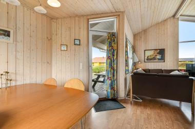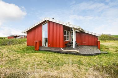 Dette dejlige og hyggelige feriehus i træ er perfekt til et par eller den lille familie som ønsker at bo roligt og tæt på Vesterhavet. Huset er på 55 m2. Husets entre byder velkommen og giver plads til sko og jakker. Fra Entreen kommer man til huset lyse og indbydende hjerterum som består af en kombineret stue og køkken med trægulve. Køkkenet er godt indrettet med keramisk komfur, emhætte, køleskab med 10 l fryser. Stuen er med F-TV med fibernet-TV med danske og tyske programmer, DVD og en skøn brændeovn, som sørger for en behagelig varme også på de kolde dage. Badeværelse med toilet, håndvask og bruser samt vaskemaskine og klinkegulv. 2 soverum: 1DS + 1K. Fra stuen er der en stejl stige op til hemsen, hvor der er 2 sovepladser. 1 husdyr er tilladt. Ikke rygerhus.