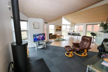 I dette hus er der en dejlig, stor stue som er med komfortable møbler, brændeovn, varmepumpe, fladskærms-TV med DR1 samt en parabol til de tyske kanaler. Der er vinduer og døre, som går fra gulv til loft, hvilket giver et fantastisk lysindfald i rummet og er med til give en rar og hyggelig atmosfære. Stor, lys spise og opholdsstue med loft til kip, flotte trægulve og hvid malede vægge, der er 3 udgange til terrasserne.