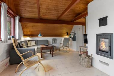 Feriehuset er på ca. 90 m2 og fremtræder næsten færdigrenoveret. Der er en hyggelig lys opholdsstue med højt til loftet. Der er gode, komfortable møbler, og på kølige aftener er det muligt at gøre opholdet behageligt ved at tænde op i brændeovnen og/eller varmepumpe. Der er installeret et nyt køkken med afdæmpede blå farvenuancer. Køkkenet indeholder de fleste moderne bekvemmeligheder såsom køl og frys, keramiske kogeplader, ovn og opvaskemaskine. Hvis feriehygge indbefatter hjemmelavet mad, så byder huset på rig mulighed dertil. Huset giver plads til 2 soveværelser i stueplan med i alt 3 sovepladser. Desuden er der en hems med to store enkeltsenge, som kan danne en dobbeltseng. Badeværelset er udstyret med toilet, håndvask, badekar og bruser.