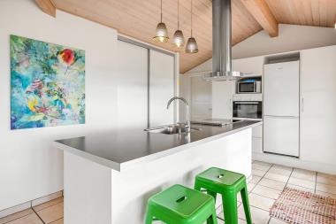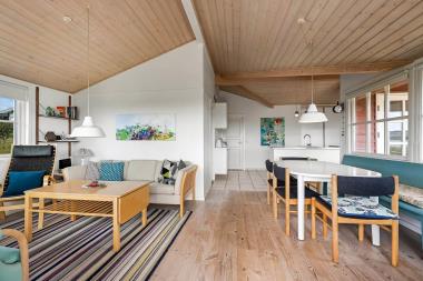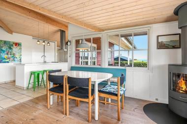 Dette flotte feriehus i træ er indrettet med store vinduespartier, og er lyst og venligt samt moderne indrettet, fra både køkken og stuen er der en skøn udsigt over Limfjorden og lystbådehavnen. I køkkenet er der klinkegulv og stuen er med trægulv. Badeværelset er indrettet med toilet, håndvask, bruser, spabad samt klinkegulv med gulvvarme. Huset er indrettet med 3 soverum: 1DS + 1DS + 2S. Køkkenafdelingen er indrettet med glaskeramisk komfur, køleskab med 90 l. separat fryser, opvaskemaskine og mikroovn. Stuen er indrettet med polstermøbler og TV med danske og tyske programmer, spisebord og stole som er placeret tæt på køkkenet, brændeovn som giver en behagelig varme uanset årstid, og sammen med varmepumpen er de begge medvirkende til at spare på forbrugsafregningen. Der er vaskemaskine og tørretumbler. Til de mindste gæster er der en barneseng. Gratis Internetadgang. 1 husdyr er tilladt. Ikke rygerhus.