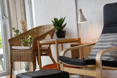 Træferiehus på ca. 90 m2. En entre byder jer velkommen til. Opholdsstuen er hyggeligt indrettet med nye møbler og smart-TV med DR-tvkanaler og tyske programmer samt Chromecast som giver mulighed for streaming af TV / radio / Apps, så har du en mobiltelefon eller et andet device med kan du streame hvad du nu har abonnement, bluetooth højtaler og spisebord. Slap af foran den knitrende brændeovn som sammen med varmepumpen hjælper med at reducere udgiften til varmeregningen. Fra stuen er der via trappe afgang til en dejlig hems som er indrette med flere muligheder for leg til begejstring for mange børn og barnlige sjæle. Via en trappe går man ned en nyere tilbygning hvor huset køkken er placeret. 3 soveværelser (1DS, 1DS, 2ES). Køkkenet har elektrisk komfur, emhætte, opvaskemaskine, mikroovn, køleskab med lille fryseboks. 2 Badeværelser med toilet, håndvask, bruser og klinkegulv. Det ene badeværelse har også gulvvarme. Der er praktiske hårde gulve i hele huset. Rygning er ikke tilladt i huset. Max 1 husdyr tilladt. Det er den oplagte feriebolig med flot udsigt.