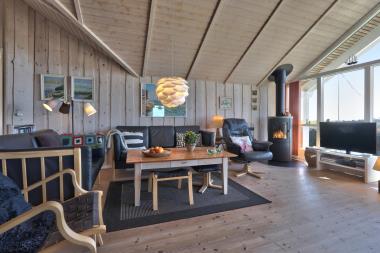 Indretningen er lys og indbydende med store vinduer, der fremhæver den imponerende udsigt. Loft til kip, moderne møbler, vægge og lofter i ludbehandlet træ samt trægulve overalt skaber en varm og hyggelig atmosfære.