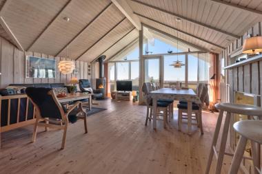 Indretningen er lys og indbydende med store vinduer, der fremhæver den imponerende udsigt. Loft til kip, moderne møbler, vægge og lofter i ludbehandlet træ samt trægulve overalt skaber en varm og hyggelig atmosfære.