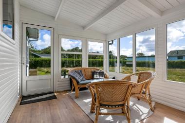 De 63 m2 er rigtigt godt udnyttet. Køkkenhjørne og opholdsstue stue er i samme rum. polstermøbler, smart-tv med danske og tyske kanaler samt mulighed for streaming via Apple-tv. Fra opholdsstuen er der udgang til er lys og venlig spisestue med spisebord og siddepladser. Herudover der også en fantastisk havestue med god plads og udgang til terrassen. Det flotte nye køkkenhjørne byder på det man skal bruge. Glaskeramiske kogeplader, indbygningsovn, køle-/fryseskab og opvaskemaskine 2 soveværelser (1DS, 1DS). Der er niveauforskel ved indgangen til begge soveværelser og fra det største soveværelse er der direkte udgang til terrassen. Lille badeværelse med toilet, håndvask og bruser. Ikke rygerhus. Max 2 husdyr tilladt.