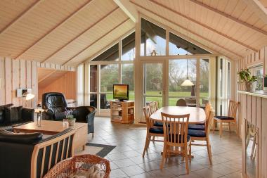 Køkken og stue er i samme rum og her er rigeligt plads til at hygge sig. Her er nemlig gulvvarme på klinkegulv som giver en dejlig ren og varm atmosfære. Huset fremtræder lyst og venligt med store vinduer. Her er flotte møbler, brændeovn, fladskærm med DR1 og parabol med tyske kanaler. Hertil er der DVD, stereoanlæg med CD. I stuen er der desuden en alkove med 2 sovemuligheder.Køkkenet byder på det man skal bruge: Glaskeramisk komfur, køle-/fryseskab, mikrobølgeovn og opvaskemaskine plus endda en børnehøjstol. Hertil er der 3 gode soveværelser hvoraf 2 af værelserne er med dobbeltsenge og så et enkelt værelse med køjeseng. Så i alt er der 3 soveværelser + alkoven med plads til 2. Huset udmærker sig med den luksus at der er 2 gulvopvarmede badeværelser. Det ene består har både boblebad, håndvask, toilet og bruser, mens det andet har en håndvask og et toilet. I det lille bryggers er der vaskemaskine og i udhuset har man tørretumbleren. Ikke rygerhus