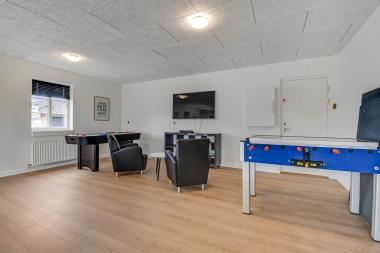 Husets primære rum er det store køkkenhjørne som er kombineret med en stor, rummelig opholdsstue med gulvvarme, spiseplads og gode muligheder for afslapning. Køkkenet er fuldt udstyret og der kan nemt laves en fantastisk middag til alle husets beboere. I de dejlige møbler kan man nyde såvel danske som tyske kanaler på fjernsynet, hvor der også kan afspilles DVD. På de kølige aftener kan der tændes op i brændeovnen, som giver ekstra hygge. Huset har stor wellnessafdeling med stor lækker swimmingpool med ruchebane, sauna og spabad. Der er 4 badeværelser som alle har både toilet, brus og gulvvarme. I stueetagen er der 4 soveværelser til 8 personer og på første sal er der yderligere en dejlig opholdsstue med TV, 5 soveværelse til 10 personer samt en stor hems med 6 sovepladser. på 1. sal er der også et badeværelse med en dejligt badekar. Er du til aktivitet så er huset aktivitetsrum lige noget for dig. Billardbord, bordfodbold, airhockey, playstation 3 og bordtennis er blandt nogle af rummets muligheder.
