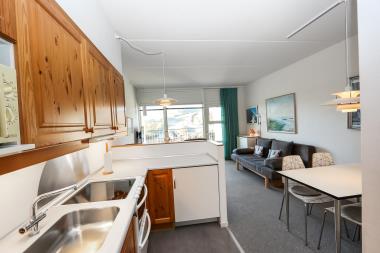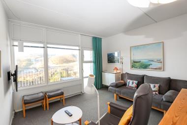 Pæn ferielejlighed til 4 personer beliggende på 1. sal. Kombineret stue og køkken. Stuen er indrettet med kabel-TV, læder og polstermøbler og gulvtæppe. I stuen er der en sovesofa med plads til 2 personer. Fra stuen er der udgang til overdækket balkon med havemøbler. Køkkenet er med glaskeramisk komfur, emhætte, køleskab med lille 10 l frostboks, opvaskemaskine og mikroovn, linoleumsgulv. Badeværelse med toilet, håndvask og bruser. 1 soverum: 1DS og gulvtæppe. Trappen til 1. sal består af 14 trappetrin.