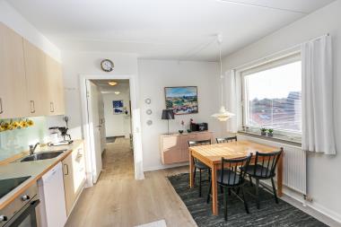 Lyst og dejlig indrettet hjørneferielejlighed beliggende på 1. sal. Kombineret stue og køkken. Stuen er indrettet med polstermøbler, sovesofa med plads til 1. person, kabel-TV, CD, radio og linoleumsgulv. Køkkenet er indrettet med glaskeramisk komfur, køleskab med 10 l frostboks, emhætte og linoleumsgulv. Badeværelse med toilet, håndvask og bruser. 1 soverum: 2S og gulvtæppe. Fra stuen er der udgang til overdækket balkon med havemøbler. Trappen til 1. sal består af 14 trappetrin.