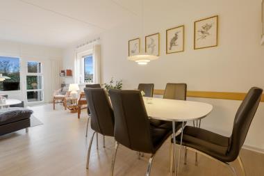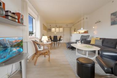 Dejlig ferielejlighed i stueplan til 6 personer. Lejligheden er indrettet med 2 soverum: 1S + 1DB og 1DB + 1K. Kombineret stue og køkken. Hyggelig indrettet stue med læder og polstermøbler samt kabel-TV, radio og CD afspiller. Køkken med glaskeramisk komfur, emhætte, opvaskemaskine og køleskab med lille frostboks, linolium i køkkenafdelingen. Badeværelse med bruser, håndvask og toilet. Fra stuen er der udgang til en dejligt lille delvis overdækket og indhegnet terrasse med havemøbler. Til de mindste gæster er der en barneseng til rådighed.