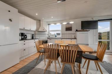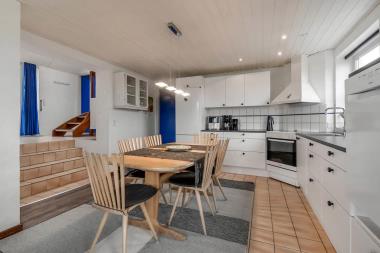 Dejligt stor entre med trappeopgang til 1. sal, hvor der er 2 soverum med hver en doppeltseng samt badeværelse med toilet, håndvask, vaskemaskine og tørretumbler. Fra det ene soverum på 1. sal er der udgang til en lile balkon med flot udsigt over området og klitterne. I stueplan finder I køkkenet med el-keramisk-komfur, opvaskemaskine, microovn og køleskab med 80 l fryser. Stuen, som er i forbindelse med køkkenet, er indrettet med dejlige polster-møbler og TV med danske og tyske programmer, der er desuden CD-afspiller. Baderummet med 5 personers standvansspa, der står med opvarmet vand hele tiden, har en helt speciel atmosfære p.g.a. den buede væg med store vinduer, hvorfra man har en flot udsigt over klitterne. Desuden er der bruser, toilet og adgang til sauna i dette rum. Trægulve i soverummene og i opholdsstuen er der mahonigulv. Resten af huset har klinkegulv. 4 soverum: DS + 2 ES + på første etage: (DS + Balkon) + DS, Gratis trådløs internetforbindelse i huset. Til huset hører også en dejlig terrasse (muligt at lukke af for børn og hunde) med havemøbler, solsejl, liggestole samt sandkasse og gynger. Ikke rygerhus. Og har man el-bil eller en Plug-In hybrid, så er der til huset et ladestik. Der er adgang til Harboøre-Centeret