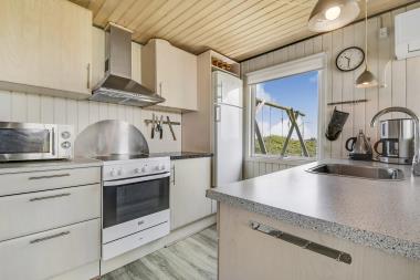 Godt udnyttet feriehus på ca. 69 m2 med 3 soveværelser (1DS, 1DS, 1S).  Huset blev senest renoveret i 2021 og er indrettet med læderrmøbler, spiseplads, TV med danske og tyske programmer samt Chromecast som giver mulighed for streaming af TV / radio / Apps og DVD-afspiller. En hyggelig brændeovn samt varmepumpe søger for en billigere el-regning og ekstra hygge samt varme til de rå dage ved Vesterhavet. Praktisk køkkenhjørne med bl.a. opvaskemaskine, komfur med keramiske kogeplade, emhætte samt køleskab med fryseboks. Badeværelse med toilet, håndvask, bruseniche og klinkegulv samt vaskemaskine. Der er praktiske gulve i hele huset. Husdyr tilladt. Ikke ryger hus.