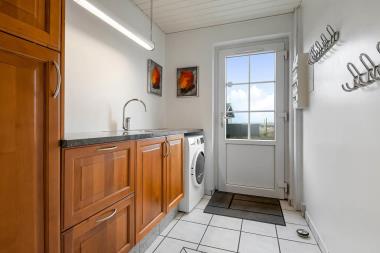 Stråtægt feriehus med lækker halvcirkelformet poolafdeling med rund 5 personers spa og direkte adgang til Sauna, hvorfra der er overblik over poolrummet. 20 kvm pool, vandrutschebane, svømmetræner. Huset ligger på en naturgrund tæt ved Vesterhavet og der findes ca. 60 qm åbne og afskærmede terrasser. Feriehuset er smagfuldt indrettet med granitgulve i stueplan med gulvvarme, lyse vægge og ludbehandlede lofter. Værelserne er tæppebelagte. 3 Badeværelser med toilet, håndvask og bruser, det ene badeværelse er i poolafdelingen. 6 soveværelser: (DS) + (DS) + (DS) + (DS) + (4K) + (4K). Barneseng og barnestol. Der er DR 1 og TV 2 i huset og gratis internetadgang. Der er installeret varmepumpe i huset, hvilket betyder en besparelse på energiforbruget. Vaskemaskine og tørretumbler. Max. 2 husdyr i huset