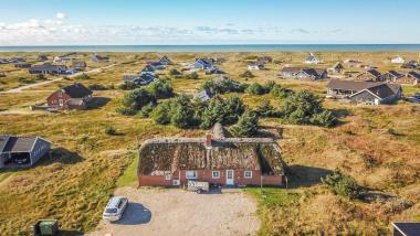 Stråtægt feriehus med lækker halvcirkelformet poolafdeling med rund 5 personers spa og direkte adgang til Sauna, hvorfra der er overblik over poolrummet. 20 kvm pool, vandrutschebane, svømmetræner. Huset ligger på en naturgrund tæt ved Vesterhavet og der findes ca. 60 qm åbne og afskærmede terrasser. Feriehuset er smagfuldt indrettet med granitgulve i stueplan med gulvvarme, lyse vægge og ludbehandlede lofter. Værelserne er tæppebelagte. 3 Badeværelser med toilet, håndvask og bruser, det ene badeværelse er i poolafdelingen. 6 soveværelser: (DS) + (DS) + (DS) + (DS) + (4K) + (4K). Barneseng og barnestol. Der er DR 1 og TV 2 i huset og gratis internetadgang. Der er installeret varmepumpe i huset, hvilket betyder en besparelse på energiforbruget. Vaskemaskine og tørretumbler. Max. 2 husdyr i huset