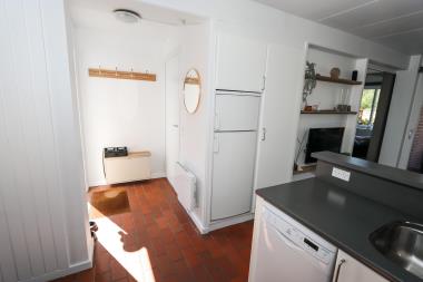 Lejligheden, som er beliggende i stueetagen, er hyggeligt indrettet i maritim stil. Opholdsstuen er med TV dansk og tysk tv (RTL og Eurosport1), Chromecast til Streaming og pæne møbler. 1 soverum: (1DS) + 1 3/4 seng i forbindelse med køkkenet, hvor man med en skydedør kan lukke rummet af. Køkkenhjørne med spiseplads, komfur med glaskeramiske kogeplader, emhætte, opvaskemaskine, køleskab med lille fryseboks. Lille badeværelse med gulvvarme, toilet, håndvask og bruser. Klinkegulv i alle rum. Udgang til delvis overdækket, stor lukket, indhegnet terrasse med havemøbler og grill. Har man el-bil eller en Plug-In hybrid, så er der 4 Ladebokse til Type 2 ladestik, der kan lade op til 11 kWh ved Feriecenteret – de er lige efter miljøstationen.