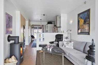 Køkken, opholdstue og spisebord er i samme store rum. Køkkenet er udstyret med elektrisk komfur med keramiske kogeplader, køleskab og mikrobølgeovn. I opholdstuen er der TV med DR, TV2, tysk EUROSPORT1 og RTL. Radio samt en dejlig brændeovn. Sovemulighederne består af et soveværelse med dobbeltseng, 1 dobbelt sovesofa i stuen. Badeværelset er udstyret med det mest nødvendige: Bruser, håndvask og toilet. Fra stuen er der udgang til lukket havestue og herfra er der udgang til terrasse med tilhørende havemøbler, så her kan man sidde og nyde udsigten både morgen og aften om man vil. Har man el-bil eller en Plug-In hybrid, så er der 4 Ladebokse til Type 2 ladestik, der kan lade op til 11 kWh ved Feriecenteret – de er lige efter miljøstationen.