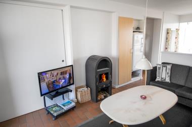 Køkken, opholdsstue og spisebord er i samme store rum. Køkkenhjørnet er udstyret med komfur med glaskeramiske kogeplader, emhætte, køleskab med lille fryseboks, opvaskemaskine samt spiseplads. I opholdsstuen er der polstermøbler, brændeovn, TV med DR, TV2, tysk EUROSPORT1 og RTL. Sovemulighederne består af et soveværelse med dobbeltseng og 1 dobbelt sovesofa i stuen. Badeværelset er udstyret med bruser, håndvask, toilet og klinkegulv med gulvvarme. Fra stuen er der udgang til terrasse, der kan lukkes helt af så det kan bruges som udestue med tilhørende havemøbler, så her kan man sidde og nyde udsigten både morgen og aften. Har man el-bil eller en Plug-In hybrid, så er der 4 Ladebokse til Type 2 ladestik, der kan lade op til 11 kWh ved Feriecenteret – de er lige efter miljøstationen.