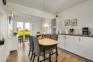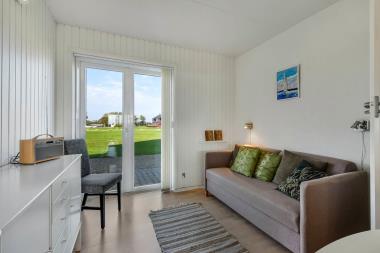 Lejligheden er beliggende i stueetagen. Flot renoveret i lyse og venlige farver. Opholdsstuen er indrettet med pæne polstermøbler, der er desuden installeret varmepumpe som hjælper med et lavere forbrug, dobbelt sovesofa, radio, TV med danske kanaler og tysk RTL og Eurosport1. 1 soverum: (1DS) + dobbelt sovesofa i stuen med 2 sovemuligheder. Flot køkkenhjørne med spiseplads, kombineret glaskeramisk komfur´og miniopvaskemaskine, emhætte, mikroovn og køleskab med fryseboks. Lille badeværelse med gulvvarme, toilet, håndvask og bruser. Flot trægulv i alle opholdsrum. Udgang til 10m2 stor udestue, hvorfra der er adgang til en lækker nyanlagt terrasse med havemøbler. Har man el-bil eller en Plug-In hybrid, så er der 4 Ladebokse til Type 2 ladestik, der kan lade op til 11 kWh ved Feriecenteret – de er lige efter miljøstationen.