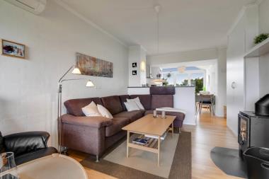 Lejligheden er renoveret i 2015 med blandt andet nyt køkken med opvaskemaskine. Her er glaskeramisk komfur, emhætte, køleskab med separat fryser på 10 liter. Der er trægulv over det hele med undtagelse af badeværelset som er belagt med klinker. Stuen er hyggelig indrettet med sofabord, sofagruppe, brændeovn, samt kabel-tv med DR, TV2, tysk EUROSPORT 1 og RTL, der er installeret varmepumpe i huset og det betyder at du som gæst kan spare en del på din elvarmeregning – varmepumpen leverer op til 4 gange så meget effekt som den bruger, det betyder at for hver kilowatt-time pumpen bruger yder den varme svarende til ca. 4 kW energien udnyttes dermed langt bedre. Her er også direkte udgang til balkon med havemøbler. Der findes også en anden stue med spisebord hvor der er en sofa, der kan laves om til sovesofa til 2. Her kan man vågne op til udsigt over limfjorden, men solens står op i øst. Herudover er der soveværelset med dobbeltseng samt en hems med 2 sovemuligheder. Vær opmærksom på at for at komme op på hemsen skal man kravle op ad en ribbe. Har man el-bil eller en Plug-In hybrid, så er der 4 Ladebokse til Type 2 ladestik, der kan lade op til 11 kWh ved Feriecenteret – de er lige efter miljøstationen.