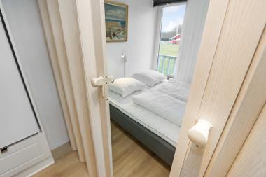 Lejligheden har egen privat indgang. Køkkenet har glaskeramisk komfur, køle/fryseskab med separat fryser på 10 liter. Hertil er der også et spisebord. Stuen byder også på komfort med hyggelige møbler og sofabord samt brændeovn. Fra stuen er der udgang til den sydvendte balkon. Herudover er der fladskærm med DR, TV2, tysk EUROSPORT1 og RTL. Der er to soveværelser med en dobbeltseng i hvert værelse. Badeværelset indeholder et brusebad, håndvask og toilet. Har man el-bil eller en Plug-In hybrid, så er der 4 Ladebokse til Type 2 ladestik, der kan lade op til 11 kWh ved Feriecenteret – de er lige efter miljøstationen.