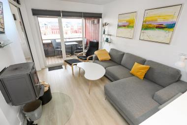 Lejligheden har egen privat indgang. Køkkenet har glaskeramisk komfur, køle/fryseskab med separat fryser på 10 liter. Hertil er der også et spisebord. Stuen byder også på komfort med hyggelige møbler og sofabord samt brændeovn. Fra stuen er der udgang til den sydvendte balkon. Herudover er der fladskærm med DR, TV2, tysk EUROSPORT1 og RTL. Der er to soveværelser med en dobbeltseng i hvert værelse. Badeværelset indeholder et brusebad, håndvask og toilet. Har man el-bil eller en Plug-In hybrid, så er der 4 Ladebokse til Type 2 ladestik, der kan lade op til 11 kWh ved Feriecenteret – de er lige efter miljøstationen.