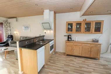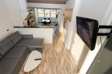 Lejligheden er beliggende på 1. sal. og er flot renoveret i lyse og venlige farver. Opholdsstuen er med danske kanaler og tysk RTL og Eurosport1, radio og lædermøbler. 1 soverum: (1DS) + hems med 2 sovemuligheder + 1 dobbeltsovesofa i stuen. Flot køkkenhjørne med spiseplads, keramisk kogeplade, indbygningsovn, emhætte, opvaskemaskine, mikroovn, spiseplads og varmepumpe. Lille badeværelse med gulvvarme, toilet, håndvask og bruser. Flot trægulv i alle opholdsrum. Udgang til overdækket altan med havemøbler. Har man el-bil eller en Plug-In hybrid, så er der 4 Ladebokse til Type 2 ladestik, der kan lade op til 11 kWh ved Feriecenteret – de er lige efter miljøstationen.