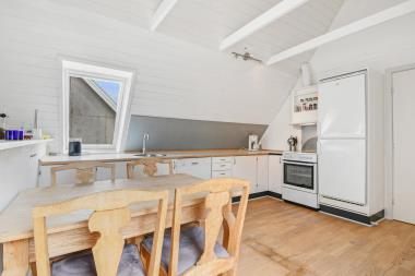 På første sal, tilgået via trappen i mellemgangen, venter jer en lys og rummelig stue med åben planløsning. Her kan I nyde panoramaudsigten over klitlandskabet og kystsikringsvejen. Køkkenet er veludstyret med en glaskeramisk kogeplade, emhætte, mikrobølgeovn, køleskab med fryser og opvaskemaskine. I stuen er der et spisebord ved det store panoramavindue og en hyggelig sofagruppe med TV, der giver adgang til både danske og tyske TV-programmer. En brændeovn bidrager til den behagelige atmosfære. Derudover er der et ekstra soveværelse med dobbeltseng på første sal.