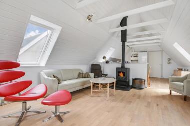 På første sal, tilgået via trappen i mellemgangen, venter jer en lys og rummelig stue med åben planløsning. Her kan I nyde panoramaudsigten over klitlandskabet og kystsikringsvejen. Køkkenet er veludstyret med en glaskeramisk kogeplade, emhætte, mikrobølgeovn, køleskab med fryser og opvaskemaskine. I stuen er der et spisebord ved det store panoramavindue og en hyggelig sofagruppe med TV, der giver adgang til både danske og tyske TV-programmer. En brændeovn bidrager til den behagelige atmosfære. Derudover er der et ekstra soveværelse med dobbeltseng på første sal.