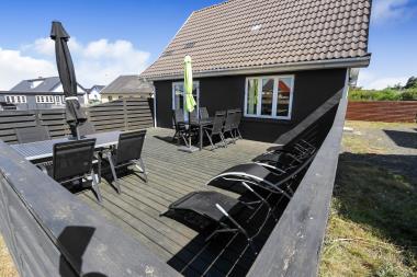 Fra stuen er der adgang til den indhegnede terrasse som skærmer for vinden. Der findes ligeledes en garage til huset og ved garagen er der en overdækket terrasse. Til terrasserne hører 3 solvogne, grill og havemøbler, så der er basis for gode hyggestunder. Ikke langt fra huset er der flere indkøbsmuligheder i byen Thyborøn. Her kan man spadsere ved havnen eller nyde en af de mest børnevenlige badestrande ved Vestkysten, som ligger på nordsiden af åbningen til Limfjorden knap 2000 meter fra huset. Dog er der endnu kortere afstand til det vilde Vesterhav hvis man går direkte mod vest og så er man lynhurtigt oppe ved stranden. Her er den dog ikke specielt børnevenlig, men man kan sagtens tage en dukkert eller bygge sandslotte, flyve med drage. Er man til vandreture ligger det beskyttede fuglereservat kun 100 meter syd for huset og her kan man for eksempel vandre helt til Harboøre over tangen. Herudover anbefaler vi også at man besøger mange af byens attraktioner såsom Sneglehuset, Sea War Museum, Jyllandsakvariet samt Kystcenteret. Slut gerne af med frisk fisk på havnen.