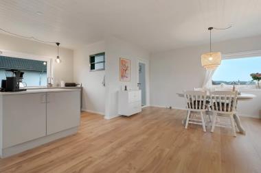 Det veludstyrede køkken har alt, hvad I behøver: glaskeramisk komfur, indbygningsovn, emhætte, køle-/fryseskab, opvaskemaskine og naturligvis gulvvarme.