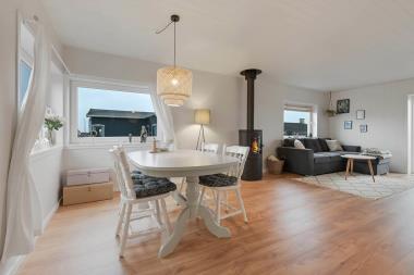 Den hyggelige stue byder på polstrede møbler, brændeovn, TV med danske programmer og behagelig gulvvarme – perfekt til afslapning efter en dag ved havet.