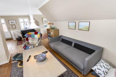 På første sal, tilgået via trappen i spisestuen, venter jer en lys og rummelig stue med åben planløsning. Her kan I nyde panoramaudsigten over Vesterhavet, klitlandskabet og kystsikringsvejen fra det dertil bygget lille forhøjning med bord og stole. Perfekt til at nyde panoramaudsigten, læse en bog, spille spil eller nyde en rolig stund med en kop kaffe. Hyggelig sofagruppe med TV, der giver adgang til både danske og tyske TV-programmer, DVD-afspiller, radio, sovesofa.