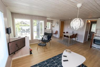Lyst og pænt sommerhus, højt beliggende i roligt ferieområde ved Toftum Bjerge. Der er trappe op til huset. Sommerhuset er indrettet med kombineret køkken og stue. Køkkenet er pænt og indrettet med keramiskkomfur, emhætte, mikrobølgeovn, køleskab med frostboks. Stuen er lyst og pænt indrettet med trægulve og pæne komfortable møbler. Der TV med enkelte danske programmer og tilsluttet parabol med mange tyske og enkelte engelske kanaler. Der DVD-afspiller, stereoanlæg med CD-afspiller, Bluetooth højtaler og gratis trådløst internet til gæsterne rådighed. Til en kølig sommeraften eller en efterårsaften med regn og rusk er der brændeovn til at sprede hygge og varme. Der er desuden energivenlig varmepumpe i huset som også kan afkøle på varme sommerdage. Der er pænt badeværelse som er indrettet med toilet, håndvask, bruseniece, praktisk håndklædetørrer og behageligt gulvvarme. Huset er indrettet til fire personer, fordelt på to gode soveværelser. Et er indrettet med dobbeltseng og et med to enkeltsenge. Fra stuen er der adgang til husets store terrasser hvor i næsten altid kan finde læ. Der kan i tilberede og nyde aftensmaden på husets grill. På den lille terrasse er der indrettet hyggelig bålplads. Et dejligt sommerhus velegnet til familier som ønsker en rolig og afslappet ferie.