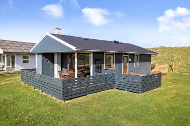 56 m2 træferiehus med 3 soveværelser (1DS, 2ES 1KS). Kombineret opholdsstue og nyere køkkenhjørne. Lige på den anden side af køkkenhjørnet er spisebordet placeret. Herudover er der tv med Chromecast, samt mulighed for streaming af TV / radio / Apps via Chromecast. Så har du en mobiltelefon eller et andet device med kan du streame hvad du nu har abonnement, radio/CD og en dejlig brændeovn som skaber ekstra hygge og varme. Pænt køkkenhjørne med komfur med keramiske kogeplader, emhætte, og køleskab med lille fryseboks. Pænt badeværelse med toilet, bruser og håndvask. Fra stuen er er kig til Vesterhavet og klitterne. Der er trægulve i alle opholds- og soverum. Ikke ryger hus. 1 husdyr tilladt.