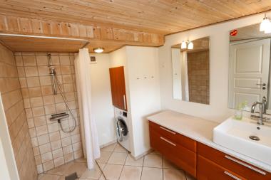 Stueplan: Dejlig entre med ekstra fryser og god trappe til 1. sal. Flot badeværelse med god plads, toilet, bruser, håndvask, vaskemaskine og klinkegulv med gulvvarme. Funktionelt køkkenhjørne med komfur med keramiske kogeplader, emhætte, opvaskemaskine og køleskab. Rummelig opholdsstue med flot spisebord i forlængelse af køkkenhjørnet, sofaer i sort læder, TV med tyske og danske kanaler og DAB-radio. Der er praktiske hårde gulve med gylvvarme i alle rum i stueplan.