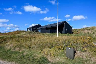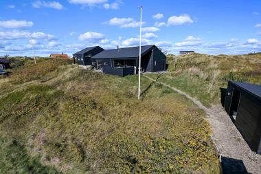 På en 2500 m2 dejlig, kuperet naturgrund med en fantastisk udsigt til klitterne, og kun 200 m fra Vesterhavet, ligger dette pragtfulde feriehus på 125 m2 + redskabsrum. Huset er minimalistisk i sit udtryk og praktisk indrettet. En flot entrè byder velkommen indeholdende skabe samt vaskemaskine og tørretumbler. Køkken alrummet er med loft til kip og betongulv. Her findes der en brændeovn, og køkkenet indeholder opvaskemaskine, keramisk kogeplade, ovn, køl og frys samt vinkøleskab. Fra køkken alrummet er der en opgang til opholdsstuen, hvor der ligeledes er loft til kip samt parketgulv. Heroppe findes der er et fladskærms-TV med danske og tyske kanaler samt chromecast. Chromecast gør det muligt via mobiltelefonen eller tablet at se film eller streaming på fladskærmen. Herudover er der en bluetooth-højtaler som også gør det muligt at høre radio eller musik via egen mobiltelefon. Huset indeholder stort badeværelse med toilet, håndvask, spa, sauna, bruseniche og gulvvarme samt udgang til ugeneret udendørsbruser et plus når man lige kommer fra stranden. Der er et mindre badeværelse med bruseniche toilet, håndvask og gulvvarme. Huset har 3 fine soveværelser med parketgulve og skabe (1DS, 1DS,, 1DS).  Der er gratis trådløs internetadgang. Der findes varmeluftpumpe, som reducerer varmeforbruget. Rygning eller husdyr er ikke tilladt.