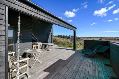På en 2500 m2 dejlig, kuperet naturgrund med en fantastisk udsigt til klitterne, og kun 200 m fra Vesterhavet, ligger dette pragtfulde feriehus på 125 m2 + redskabsrum. Huset er minimalistisk i sit udtryk og praktisk indrettet. En flot entrè byder velkommen indeholdende skabe samt vaskemaskine og tørretumbler. Køkken alrummet er med loft til kip og betongulv. Her findes der en brændeovn, og køkkenet indeholder opvaskemaskine, keramisk kogeplade, ovn, køl og frys samt vinkøleskab. Fra køkken alrummet er der en opgang til opholdsstuen, hvor der ligeledes er loft til kip samt parketgulv. Heroppe findes der er et fladskærms-TV med danske og tyske kanaler samt chromecast. Chromecast gør det muligt via mobiltelefonen eller tablet at se film eller streaming på fladskærmen. Herudover er der en bluetooth-højtaler som også gør det muligt at høre radio eller musik via egen mobiltelefon. Huset indeholder stort badeværelse med toilet, håndvask, spa, sauna, bruseniche og gulvvarme samt udgang til ugeneret udendørsbruser et plus når man lige kommer fra stranden. Der er et mindre badeværelse med bruseniche toilet, håndvask og gulvvarme. Huset har 3 fine soveværelser med parketgulve og skabe (1DS, 1DS,, 1DS).  Der er gratis trådløs internetadgang. Der findes varmeluftpumpe, som reducerer varmeforbruget. Rygning eller husdyr er ikke tilladt.