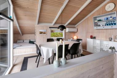 94 m2 stort, moderne træhus til max. 6 personer og med 3 soverum (1DS, 2ES, 1 ES + 1KS) og en alkove med madras og puder der helt sikkert vil tiltale de små. Opholdsstuen, som er forsænket i forhold til køkken og spiseafdeling, er med komfortable lædermøbler, TV med tyske programmer og danske programmer, radio/DVD/CD-afspiller, samt Chromecast. Sæt dig i sofaen og tænd op i brændeovnen som sammen med den installerede varmepumpe hjælper med at minimere udgiften til varmeregningen. I baggrunden kan du se de høje klitter ved Vesterhavet. Godt indrettet køkkenafdeling med alle tænkelige hjælpemidler bl.a. opvaskemaskine, komfur med keramiske kogeplader, emhætte, mikroovn og køle-fryseskab. Køkkenet er kombineret med opholds-/spisestuen. Flot Badeværelse med toilet, håndvask, lækkert spa-bad til 2 personer, håndklædetørrer og tørretumbler. Ekstra badeværelse med bruser, toilet, håndvask og vaskemaskine. Praktiske hårde gulve i hele huset og Spa-badeværelse med gulvvarme. Ikke ryger hus. Max 1 husdyr tilladt – kun hunde tilladt.