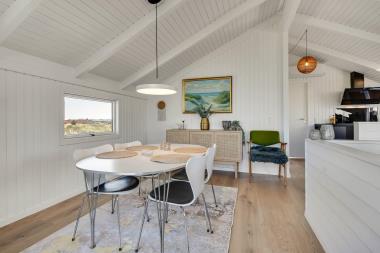 Allerede når bilen rammer grusvejen, med få meter til huset, bliver det klart at husets beliggenhed er noget ganske særligt. Huset er 106 m2 og har 4 dejlige soverum; 1DS + 1DS + 1DS + 2S. Helt nye og gode senge. I hjertet af huset findes et stort veludstyret køkken/alrum med alt i service/køkkengrej og alt i hårde hvidevarer. Det åbne køkken er bl.a med glaskeramisk komfur, emhætte, køle-/fryseskab, mikroovn og opvaskemaskine. Der er linoleumsgulv og udgang til terrassen i køkkenafdelingen. Nyd og bliv betaget af at kigge ud af vinduerne og nyd udsigten til klitterne ved Vesterhavet. Slap af i de flotte lædermøbler. Se TV på husets smart-TV som har indbygget danske og tyske TV-programmer, radio og mulighed for streaming tjenester via Chromecast, brændeovn og varmepumpe som begge sørger for en behagelig varme også i den kolde tid og samtidig er medvirkende til en reduceret forbrugsafregning. Der er linoleumsgulve i hele huset, som også er særdeles rengøringsvenlige. Der er udgang til det unikke terrasse anlæg, hvor der er udendørs vildmarksspa. 2 badeværelser begge med toilet, håndvask, bruser, gulvvarme og klinkegulv. Vaskemaskine er der naturligvis også i huset. Huset lejes ikke ud til ungdomsgrupper og der må max bo 6 personer i huset. Ikke rygerhus. Husdyr ikke tilladt.